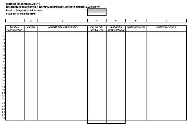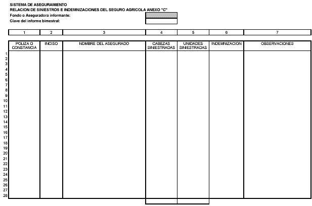 DECIMOPRIMERO.- Las Aseguradoras y Fondos deberán proporcionar a AGROASEMEX en medios magnéticos o electrónicos, un informe bimestral dentro de los quince días hábiles siguientes al término del bimestre de que se trate, en el que indicarán las unidades siniestradas e indemnizaciones pagadas por póliza o constancia de aseguramiento, como se solicita en el formato del anexo "C", que es parte de estos Lineamientos.