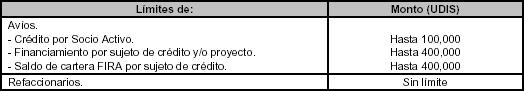 a. En créditos para conceptos de avío y refaccionario para productores PD1, el financiamiento podrá ser hasta el equivalente a 160,000 UDIS por Socio Activo y por cada uno de los proyectos en que éste participe.