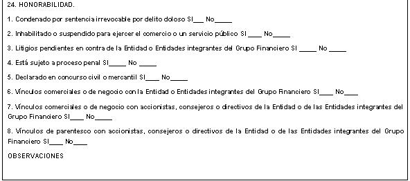 SEPTIMA.- Las Entidades Financieras al efectuar la verificación a que se refiere la Regla Segunda, deberán cerciorarse en forma previa a la designación de las personas de que se trata, cuando así corresponda, que éstas no se encuentran en alguno de los supuestos de impedimento, incapacidad, restricción o incompatibilidad que para desempeņar dichas funciones prevén las Leyes para Regular las Agrupaciones Financieras, de Instituciones de Crédito, del Mercado de Valores, de Sociedades de Inversión y las "Disposiciones de carácter prudencial a las que se sujetarán en sus operaciones los participantes en el mercado de futuros y opciones cotizados en bolsa", o bien, acorde a las políticas de la Entidad Financiera, según se trate. Tratándose de consejeros independientes y, en su caso, Miembros de Comité Técnico independientes, las Entidades Financieras deberán, además de lo antes seņalado, recabar en forma previa a la designación de aquéllos, cartas suscritas por el interesado bajo protesta de decir verdad, en las que conste: