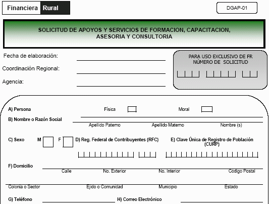 Para acceder a los servicios del Programa, los productores, las organizaciones de productores, así como los grupos interesados en constituirse como Intermediarios Financieros Rurales, deberán presentar a la FR la "Solicitud de apoyos y servicios de capacitación, asesoría y consultoría", conforme al formato aprobado por el Comité de Capacitación y Asesoría y el cual se adjunta a las presentes Reglas como Anexo No. 1. Esta solicitud contiene los siguientes datos: fecha de elaboración; Coordinación Regional y Agencia de la FR; tipo de persona; nombre o razón social; sexo; registro federal de contribuyentes; clave única de registro de población; domicilio; teléfono; actividad económica; organización a la que pertenece el solicitante; tipo de población; tipo de apoyo; monto solicitado; objetivo del apoyo o servicio solicitado; beneficiarios del proyecto; porcentaje que le corresponde cubrir al beneficiario del apoyo o servicio y . nombre y firma del interesado o representante legal.