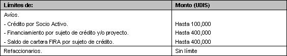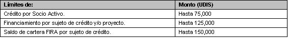c. En créditos otorgados dentro del Programa de Financiamiento Rural el monto máximo de crédito por proyecto podrá ser hasta por el equivalente a 3´400,000 UDIS y por Socio Activo a 340,000 UDIS. Tratándose de Sociedades Anónimas sólo se considerará el monto máximo de crédito por proyecto.