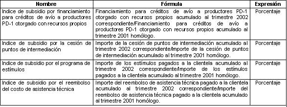 En cumplimento a lo dispuesto en el artículo 63 del Presupuesto de Egresos de la Federación para el Ejercicio Fiscal 2002, los beneficios y la efectividad de los programas del Sistema BANRURAL que canalizan subsidios serán evaluados mediante indicadores que medirán la evolución de los programas con subsidio, los cuales serán sancionados por una institución académica o de investigación de reconocido prestigio.