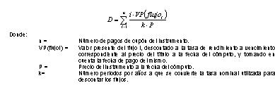 La duración de un instrumento de deuda con tasa cupón fija se calculará de acuerdo a la siguiente fórmula: