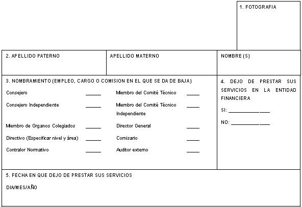 En caso de renuncia o remoción de consejeros, Miembros de Comité Técnico, Miembros de Organos Colegiados, Contralor Normativo, director general, Directivos, comisarios o auditores externos, las Entidades Financieras deberán notificar a la Vicepresidencia Jurídica y a las áreas supervisoras correspondientes de la Comisión, dependiendo de la Entidad Financiera de que se trate, tales eventos, así como su motivo, dentro de los cinco días hábiles posteriores a la realización de dichos hechos, adjuntando, en sobre cerrado de manera impresa y en disquete la información que se detalla en el formato que como anexo 2 se acompaņa a las presentes Reglas.