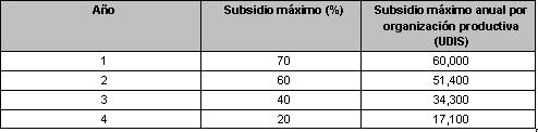 b.2. Subsidio para calificación: se otorgará Subsidio hasta por cuatro años para cubrir el costo de la empresa evaluadora de acuerdo a los porcentajes siguientes: 95%, 80%, 60% y 40% para los años 1, 2, 3 y 4, respectivamente, a través de un reembolso que no rebase el monto máximo que periódicamente establezca el FEGA.