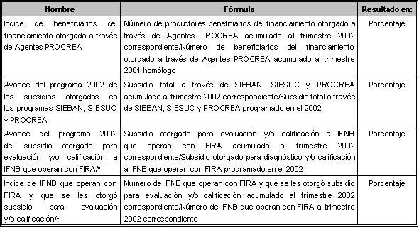 En cumplimiento a lo dispuesto en el artículo 63 del Decreto de Presupuesto de Egresos de la Federación para el Ejercicio Fiscal 2002, publicado en el Diario Oficial de la Federación del 1o. de enero de 2002, a continuación se presentan los Indicadores de Evaluación para el presente ejercicio fiscal de los programas a través de los cuales se canalizan subsidios los Fideicomisos Instituidos en Relación con la Agricultura (FIRA), los cuales se enviarán de manera trimestral a la Secretaría de Hacienda y Crédito Público y a la Cámara de Diputados.